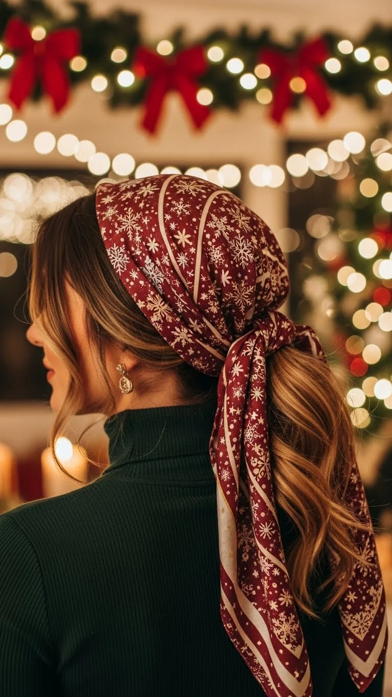 A hair scarf changes a simple pony into something festive. Tie it around the base of a low pony. Let the ends hang. Twist two small front pieces back before joining the pony. Scarves can be found for low cost at local markets. Choose red, green, or gold patterns to match the holiday season.