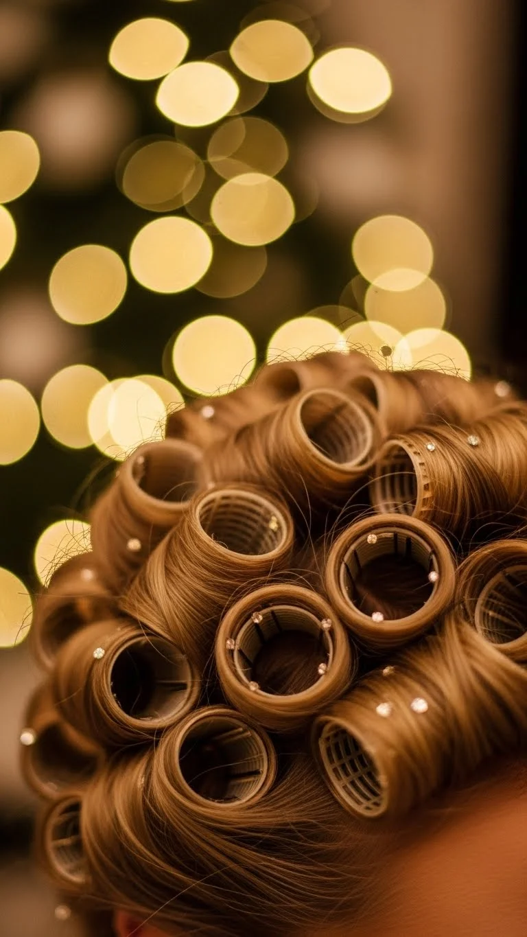 A curly updo creates height and movement. Pile curls loosely on top of your head and secure with pins. Let a few strands fall around the face. Add small glitter pins for charm. If your curls need help, use foam rollers beforehand. This style works for medium and long lengths and stays lightweight through the night.
