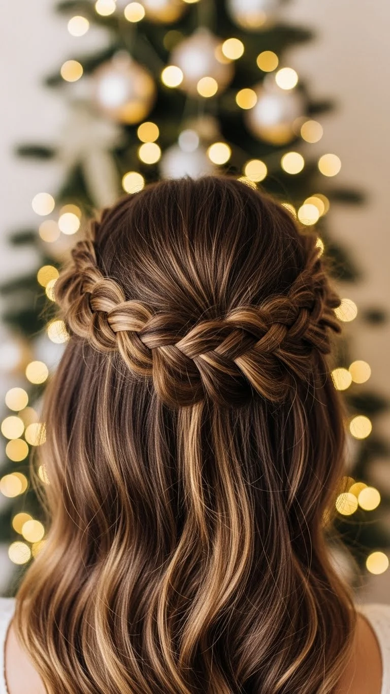 This gives a soft, fairy-tale feel. Make two small braids from each side of your head. Bring them across the back and pin. Leave the rest down. Curls or waves add texture. If you’re in a hurry, skip the curls and keep it straight. Add tiny pearl pins for a festive touch. These can be found at low prices online or at local shops. This style stays comfortable through long evenings.