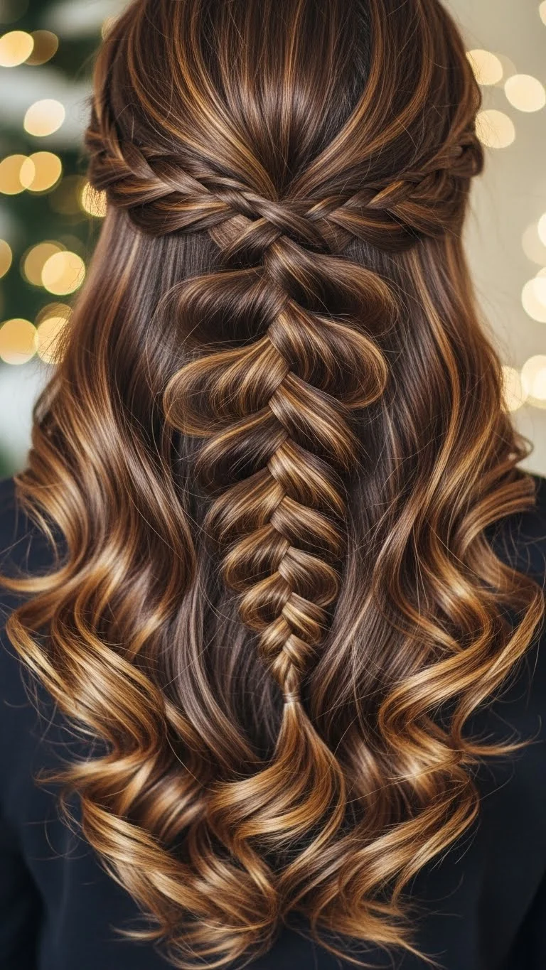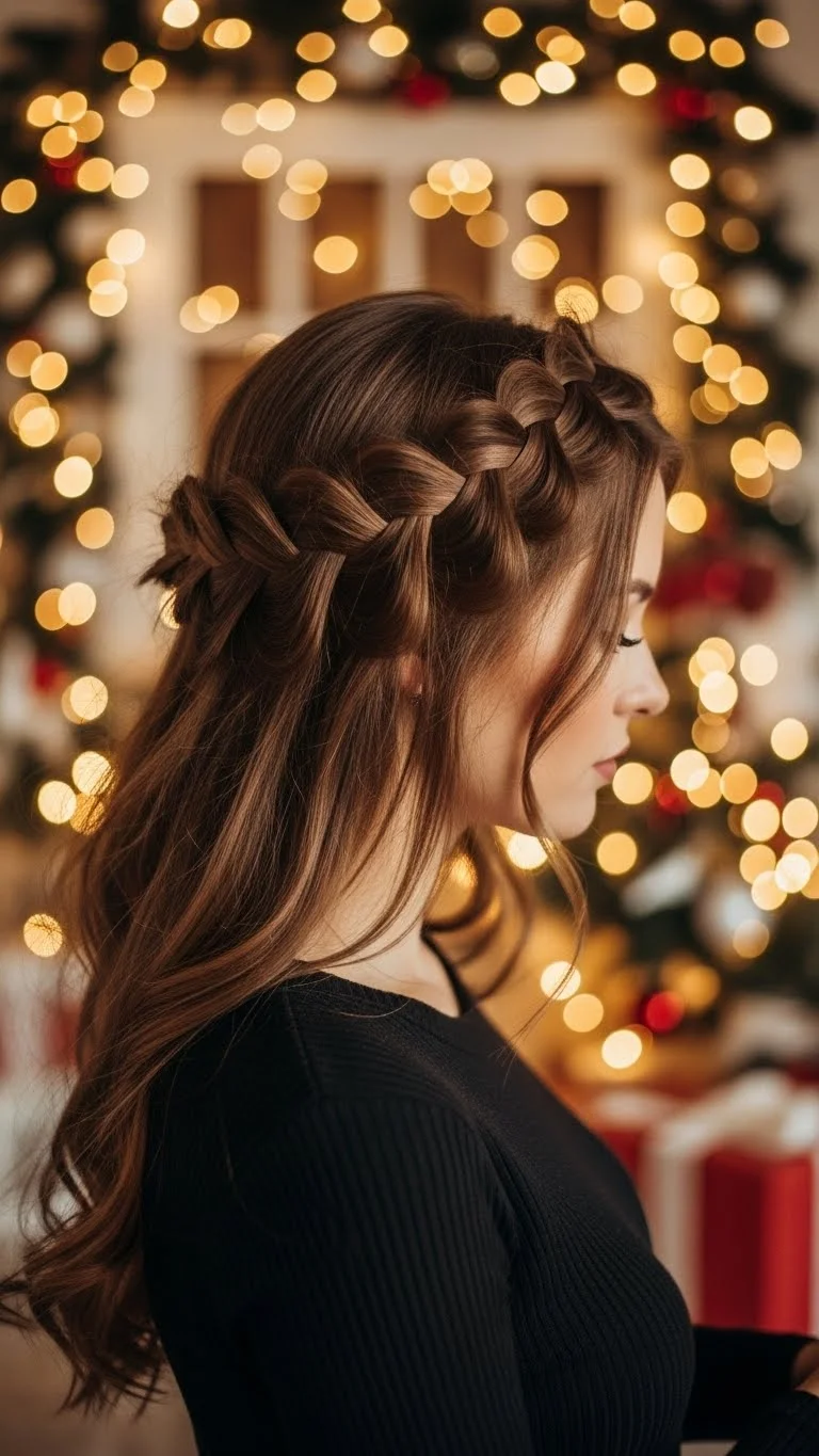 A waterfall braid lets curls peek through in a flowing pattern. Start at the front, braid sideways, and drop a piece each time as the braid continues. Curl the dropped sections lightly. This creates movement and softness. The braid sits best when done loosely, so don’t pull too tight. Add a few gold or glitter pins at random points for a festive touch. It looks detailed but costs nothing except time.