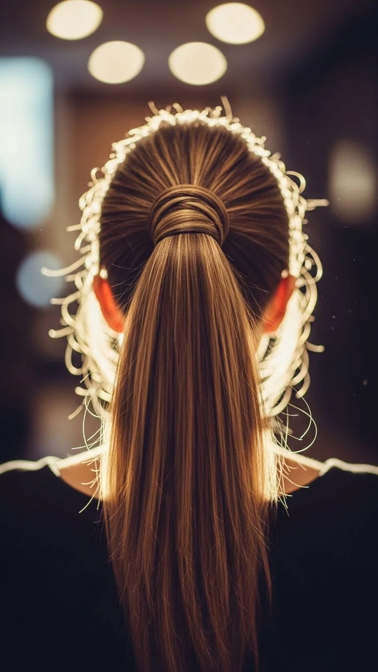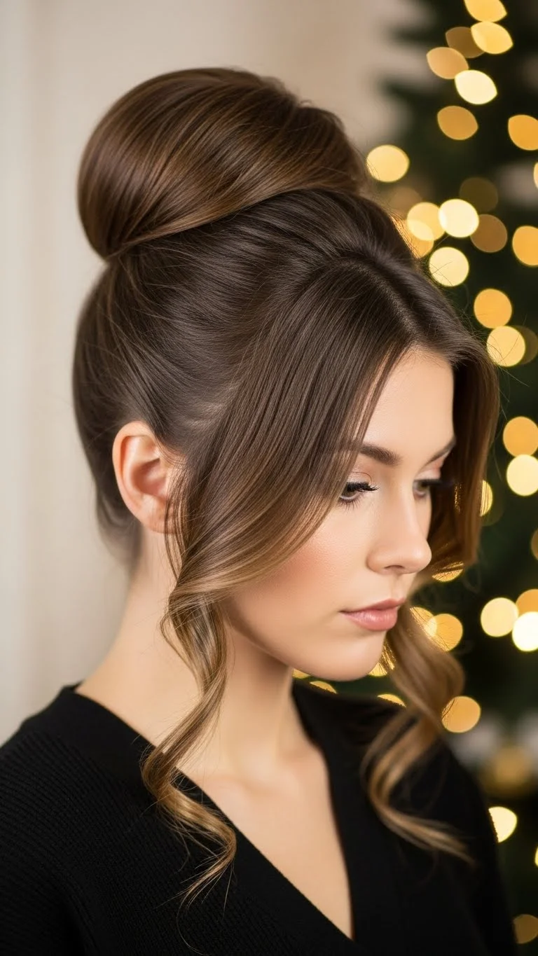 A high ponytail with a wrapped base gives height and clean lines. Brush upward, secure, and use a small strand to hide the elastic. Curl the ends or leave them straight depending on your outfit. You can add a sparkly bow clip at the top for a holiday feel. If your hair slips, use a little hairspray on the brush first. This is quick, neat, and great for dancing all night.
