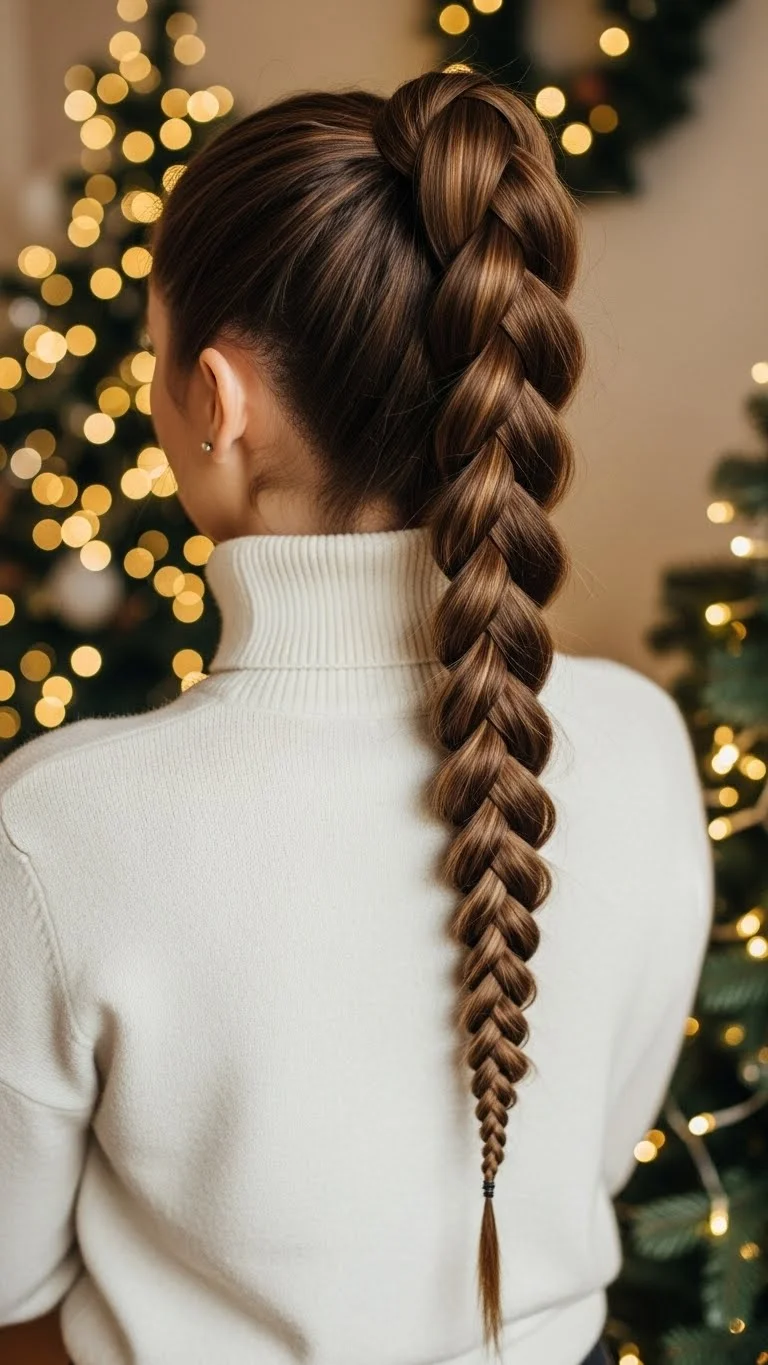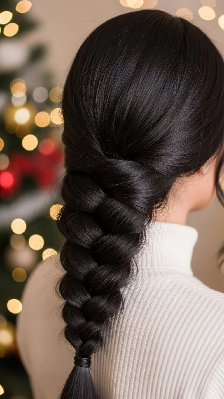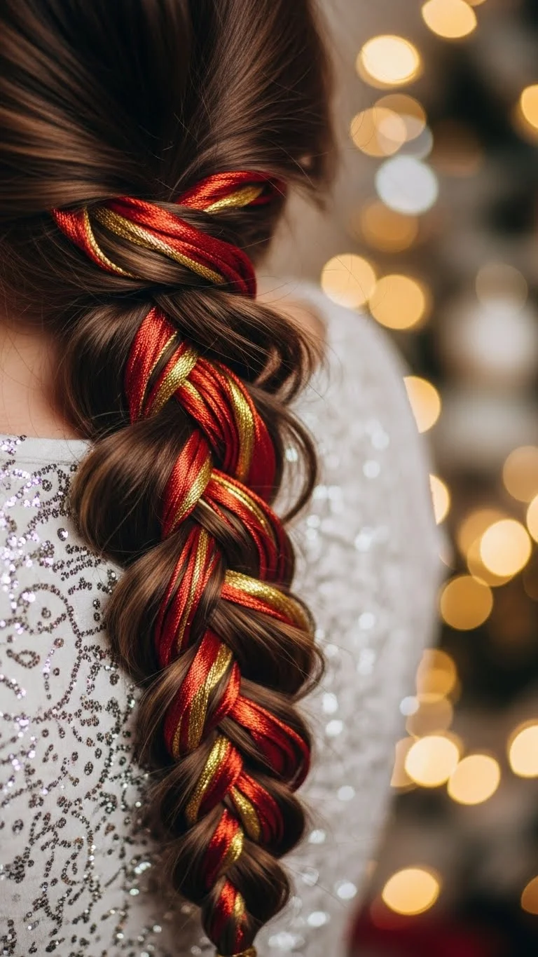 Threading a ribbon through your braid gives a holiday feel instantly. Choose red, gold, or green for a seasonal look. Braid as usual, weaving the ribbon through each strand as you go. Tie the ends together so the ribbon stays secure. This is affordable and easy, and it makes the braid look special without complex steps. A little texturizing spray helps the braid hold shape all evening.
