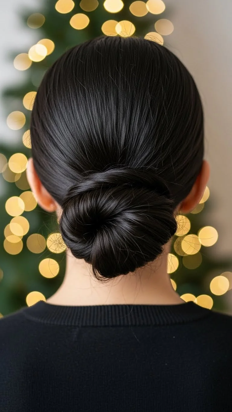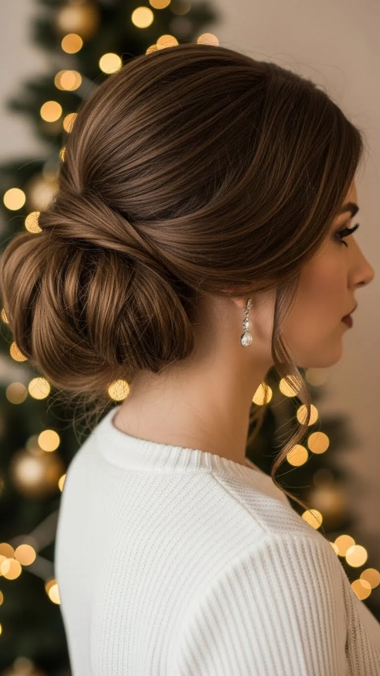 A low twist looks clean and elegant. Gather your hair at the nape, twist it, and pin it securely. Leave a few face-framing pieces if you want softness. Add a pearly clip or gold pin for a holiday feel. This style stays comfortable for hours and works well if you want something minimal. A light mist of hairspray keeps the shape neat.