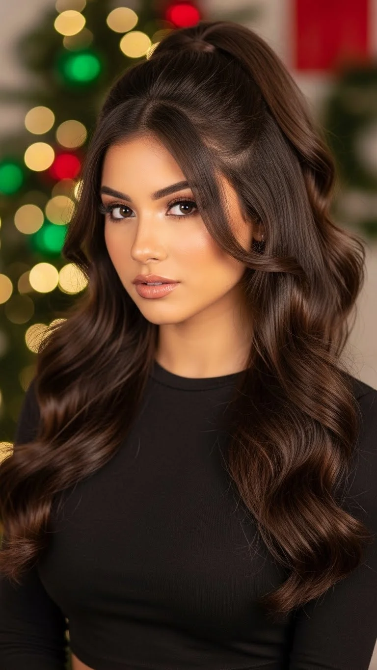 A high half-up pony adds height and shape. Gather the top half and tie it high. Curl the loose hair for bounce. This style lifts the face while keeping length. Add a bow clip for holiday charm. If your hair feels flat, tease the roots of the upper section slightly before tying. A small amount of hairspray keeps everything in place.