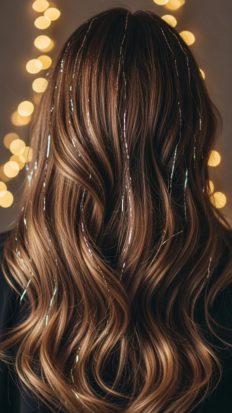 Tinsel strands add sparkle without heavy accessories. Apply a few throughout your hair, focusing near the top where lights hit. Curl your hair loosely so the tinsel moves naturally. You can find tinsel packs for a low price online or in beauty stores. Avoid too many pieces so it looks soft and classy. This catches light beautifully in party photos.