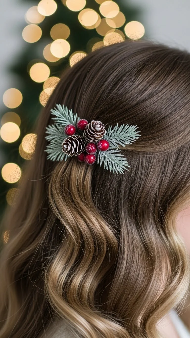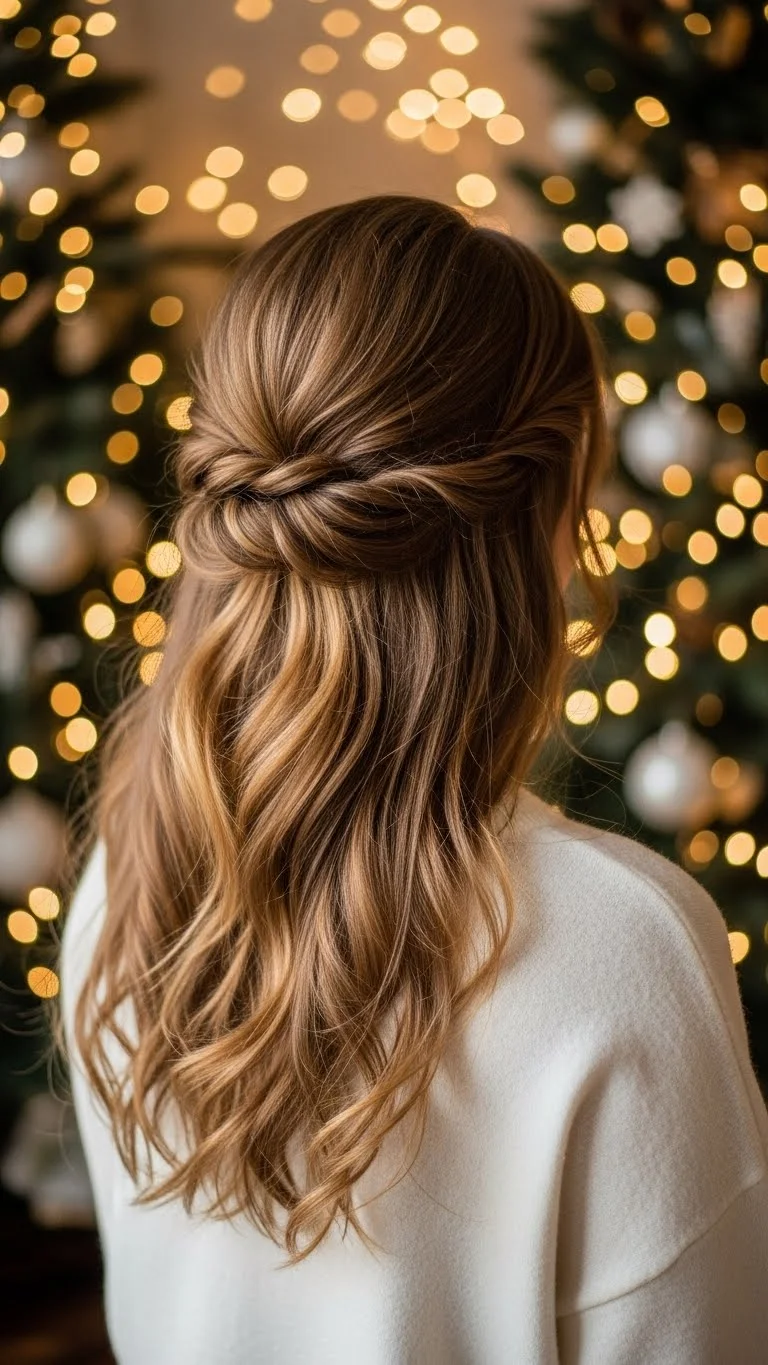 Twists create a gentle holiday detail without feeling heavy. Take a section from each side, twist them back, and pin them together. Leave the rest of your hair down in waves or curls. This works especially well on day-old hair. You can tuck tiny metallic pins where the twists meet for a small holiday accent. This is quick, easy, and works for almost any outfit. Add dry shampoo for lift if your roots sit flat.