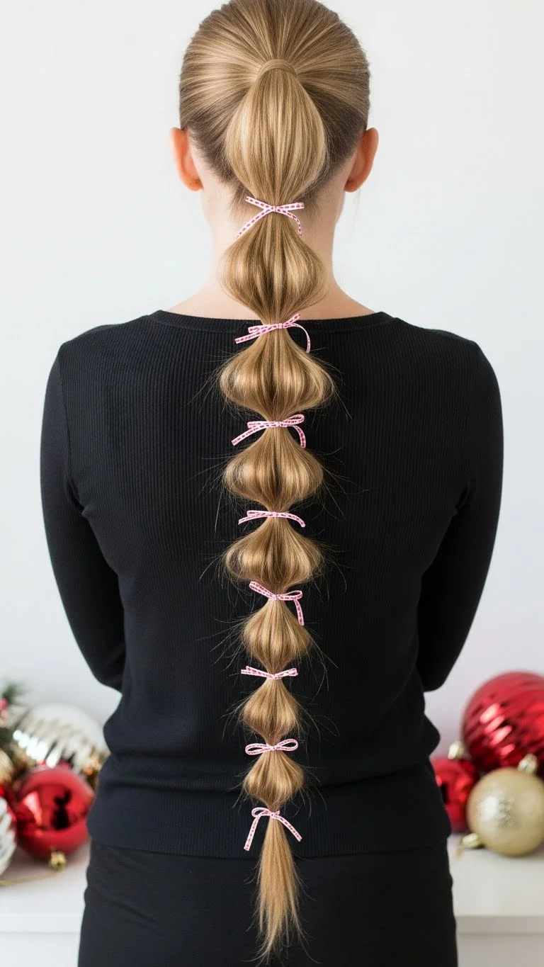 Bubble braids look fun and festive. Pull your hair into a ponytail, add elastics down the length, and gently pull each section to form rounded bubbles. Add thin ribbon ties between bubbles for a holiday twist. This works well on long straight or wavy hair. It’s easy and only takes a few minutes. A little hairspray keeps the bubbles full.
