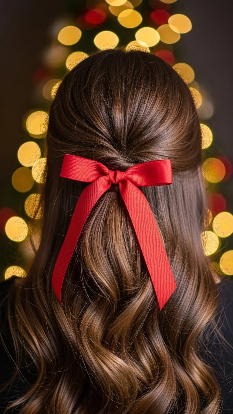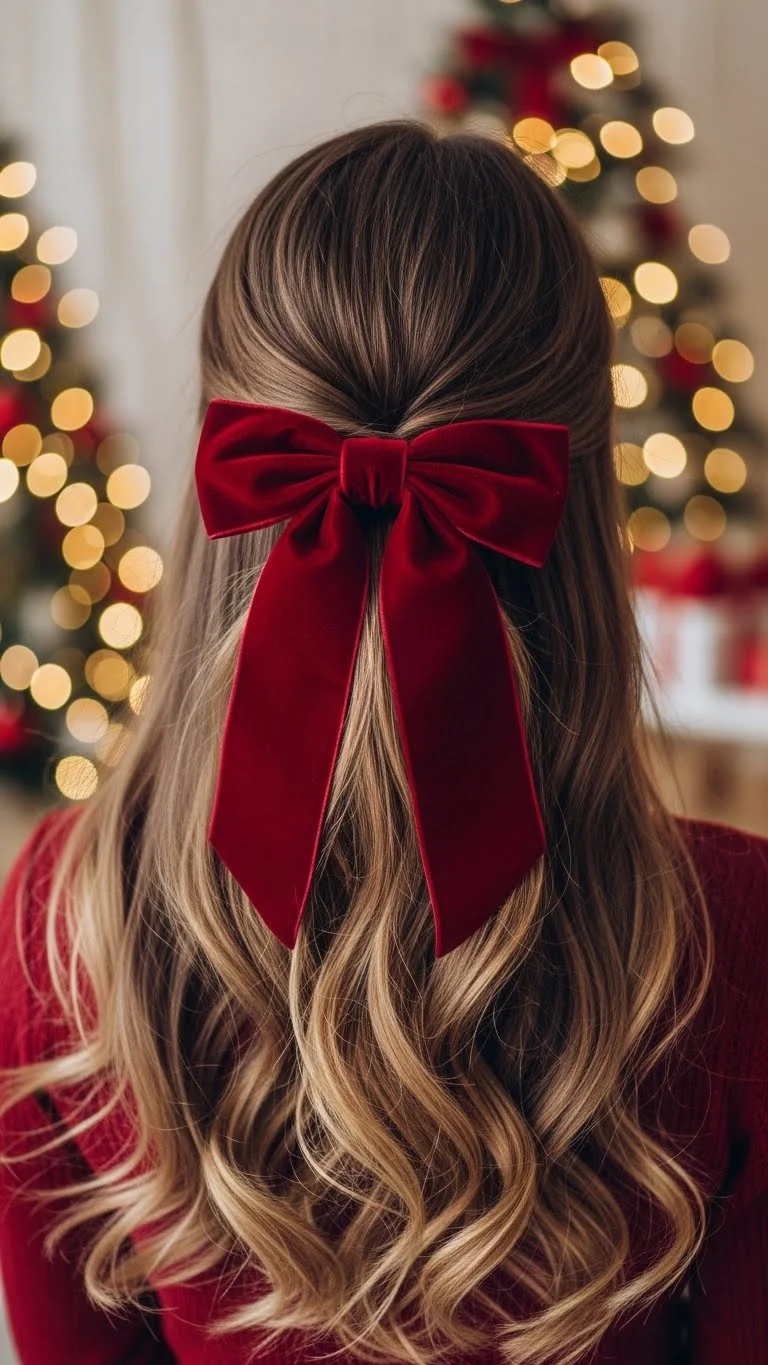 A velvet bow gives instant holiday charm. Curl your hair with a large barrel, brush it out, and tie a bow at the back using a half-up section. Choose rich colors like deep red or green. Velvet bows are affordable and easy to pin into place. This style feels graceful and looks lovely from every angle. Add a little hairspray for hold.