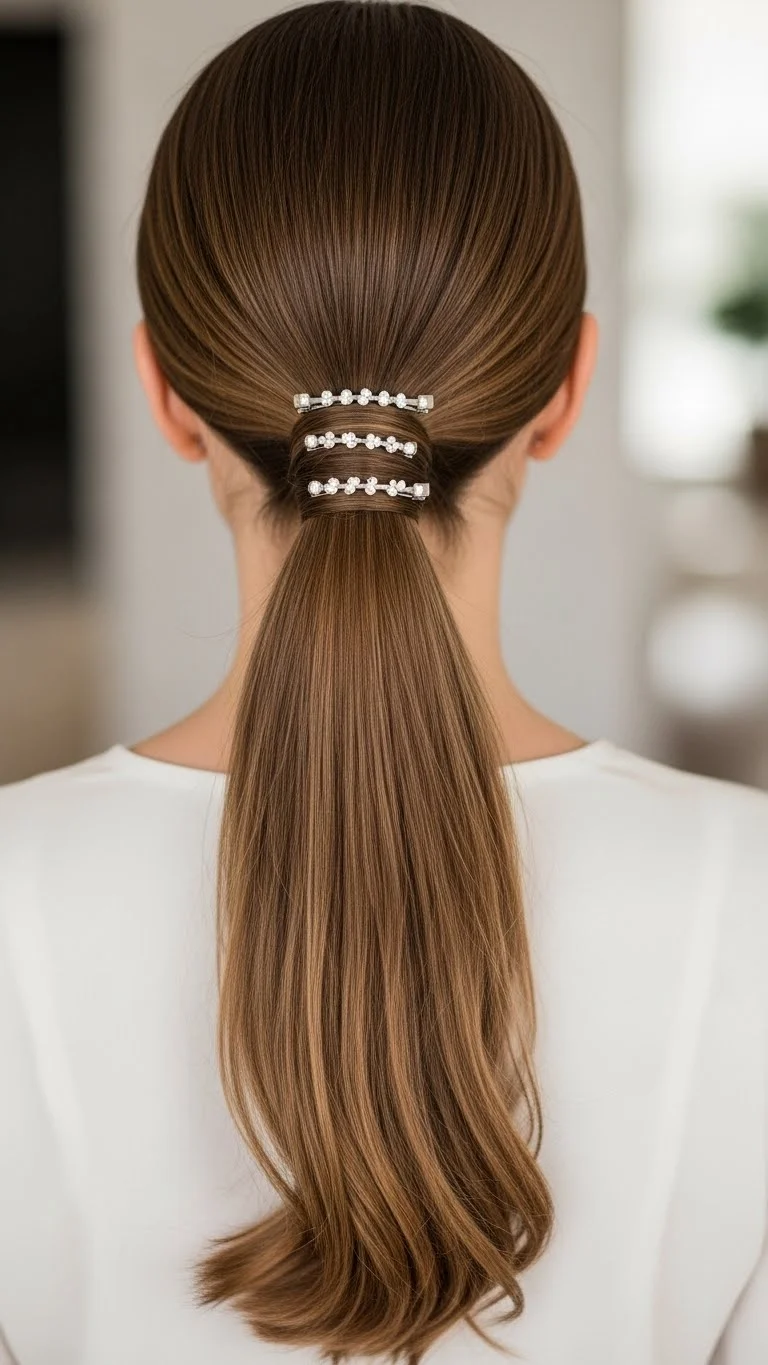 A low ponytail can feel elegant when styled clean and sleek. Smooth your hair back with a brush and secure it near the nape. Wrap a small section of hair around the elastic to hide it. Add sparkle clips along one side for a festive look. You don’t need salon accessories; small glitter clips from any store work fine. Curl the ponytail ends for soft movement. A small mist of shine spray finishes the look.