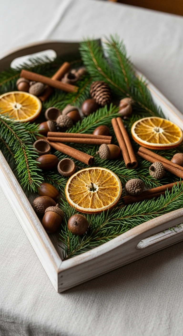 Bring nature inside with a woodsy tray. Layer pine branches, cinnamon sticks, acorns, and dried orange slices. The mix of textures and scents feels cozy and inviting. You can gather most of these items outdoors or make them yourself, making it both beautiful and affordable.