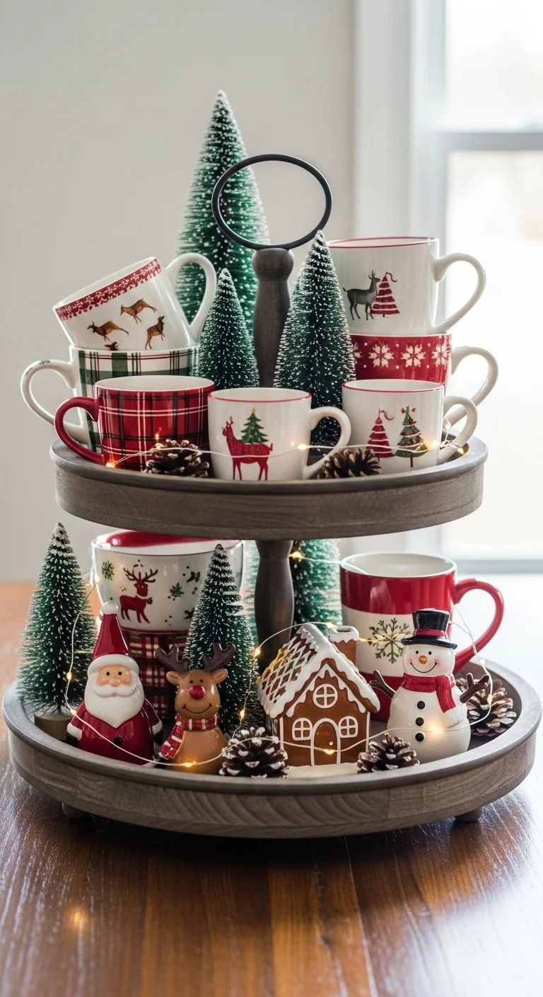 Use a two-tiered tray for maximum space. Decorate each level with small items like mini trees, mugs, and figurines. Stick to a color scheme so it doesn’t look cluttered. This works great for kitchens, coffee stations, or dining rooms.