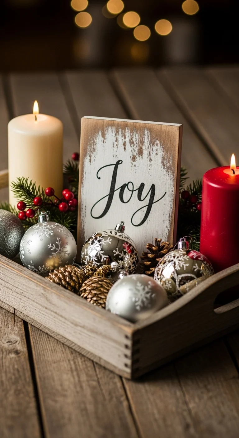 Add a word sign like “Joy” or “Noel” as the centerpiece of your tray. Surround it with candles, greenery, or baubles. Small wooden signs are inexpensive and reusable every year. This is an easy way to make your tray feel purposeful and cheerful.