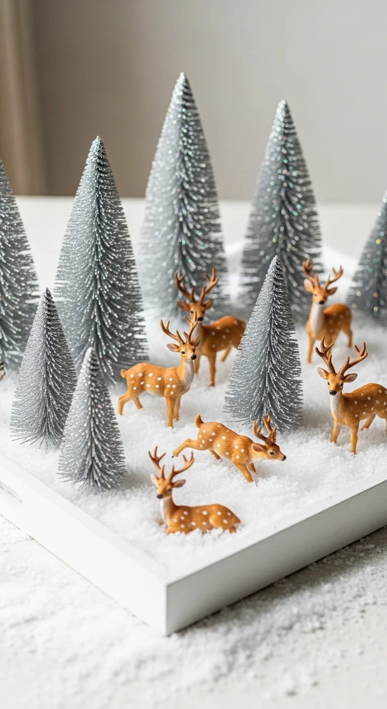 Turn your tray into a snowy scene using faux snow, silver trees, and deer figures. Keep everything light-colored for a serene winter vibe. Add fairy lights for a soft sparkle. It’s elegant and peaceful—perfect for modern or minimalist homes.