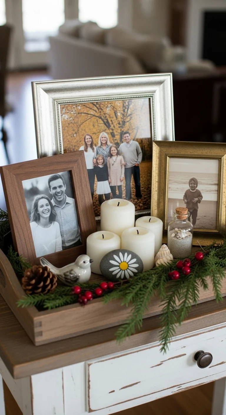 Add a personal touch with a family photo tray. Include framed holiday pictures, small ornaments, and greenery. It makes your decor sentimental and sparks conversation with guests. Simple and meaningful—just the right mix for Christmas.
