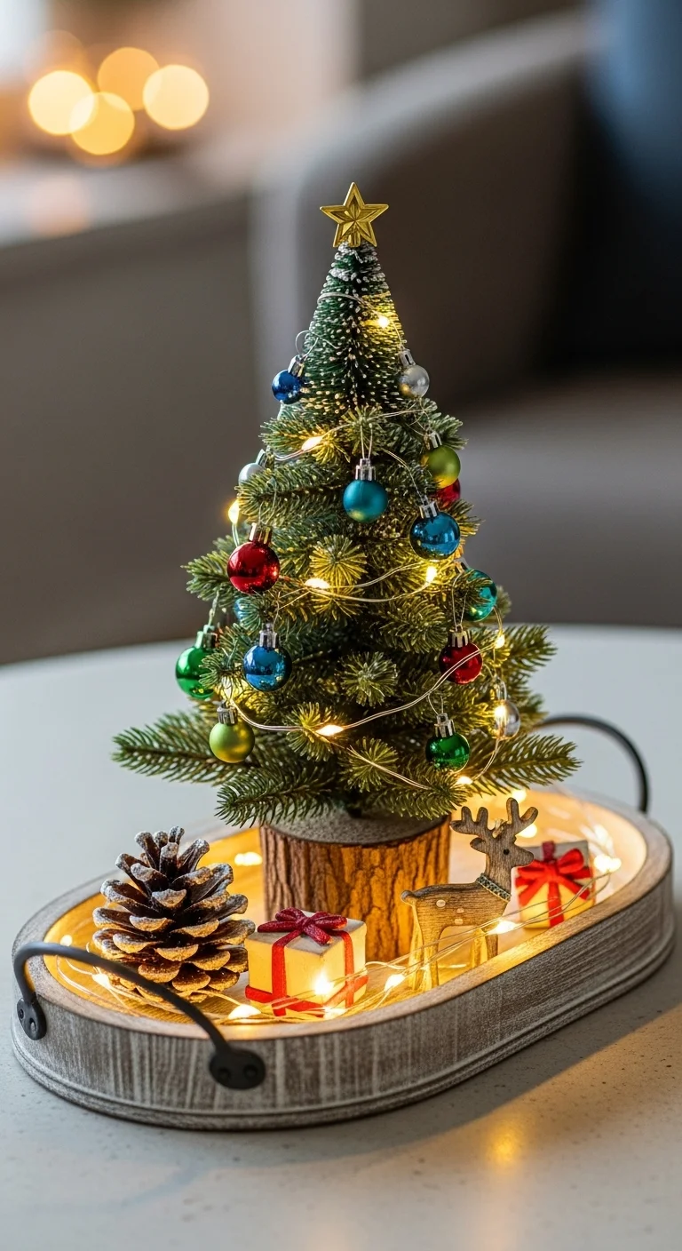 Center a mini Christmas tree in your tray and decorate around it with small ornaments or lights. Wrap the base in burlap or fabric. It’s great for small spaces where a full-sized tree won’t fit. Cute, compact, and festive.