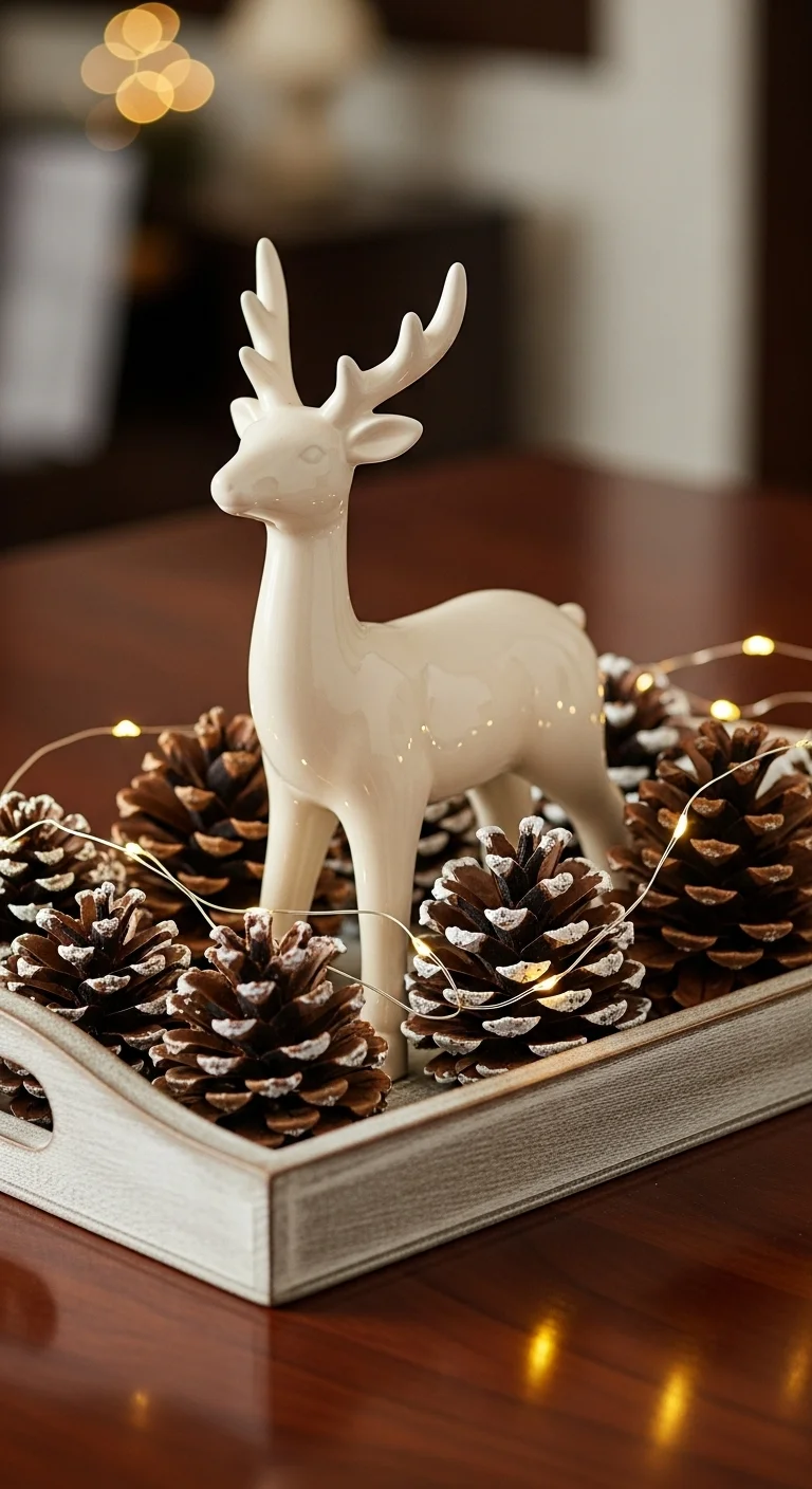 Add a reindeer figurine as your tray’s focal point. Surround it with pinecones, lights, and a few red berries. It’s simple but creates a strong holiday statement. Keep it natural and rustic for that cozy winter feel.
