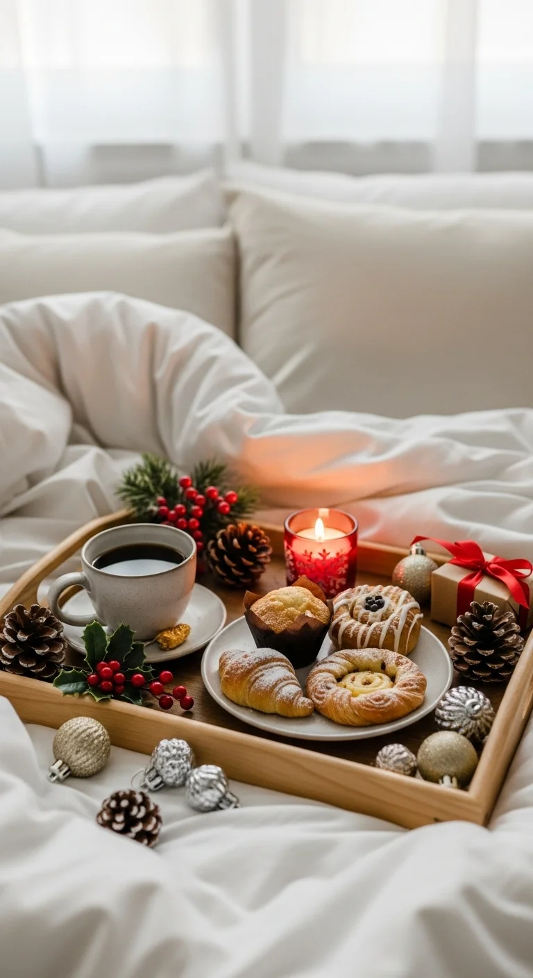 Serve breakfast in bed on a festive tray! Include a mug of coffee, pastries, and a candle. Add a few ornaments or greenery for decor. It’s a lovely surprise for family members and makes the morning feel extra special.