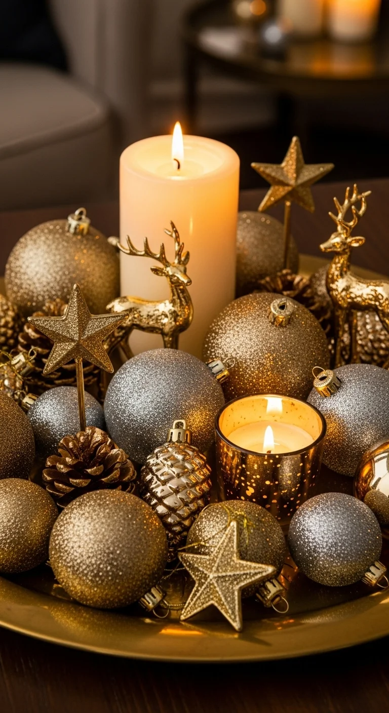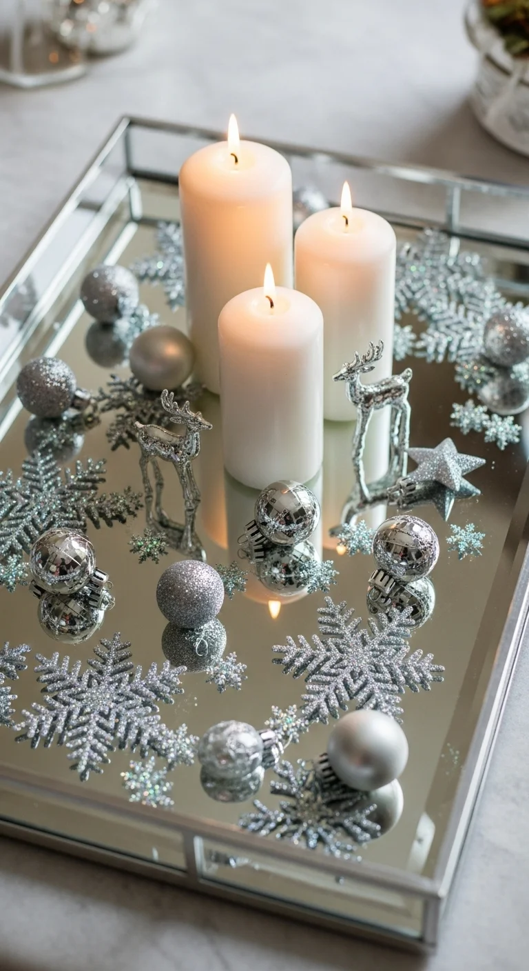 For a glam Christmas look, go with silver and white tones. Use a mirrored or glass tray and add metallic ornaments, glittery snowflakes, and a few votive candles. This setup sparkles under evening lights and feels sophisticated without being fussy.