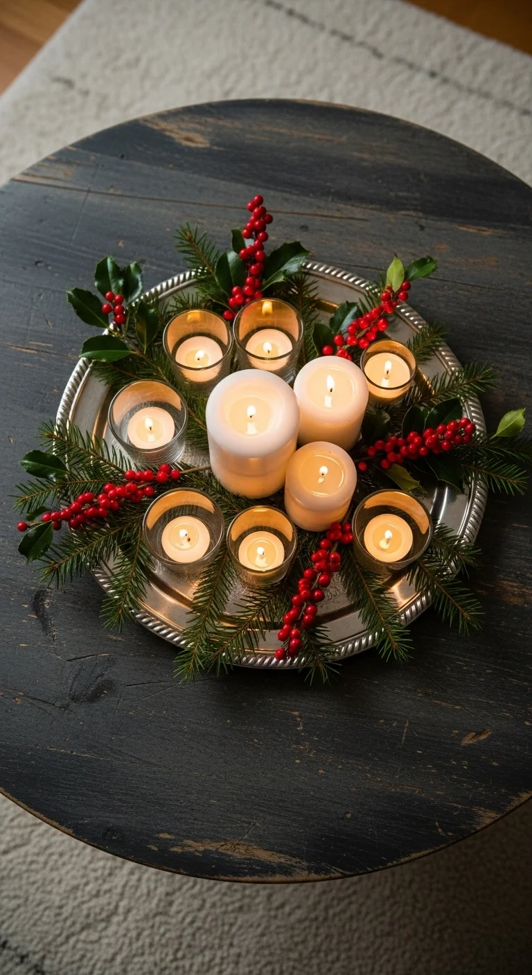 Fill your tray with candles of varying heights for a warm, glowing centerpiece. Surround them with small ornaments, pine branches, or faux snow. Stick to a color theme like white and gold for elegance. If you prefer safety, use LED candles for the same cozy glow without worry. This setup adds instant warmth to any room.