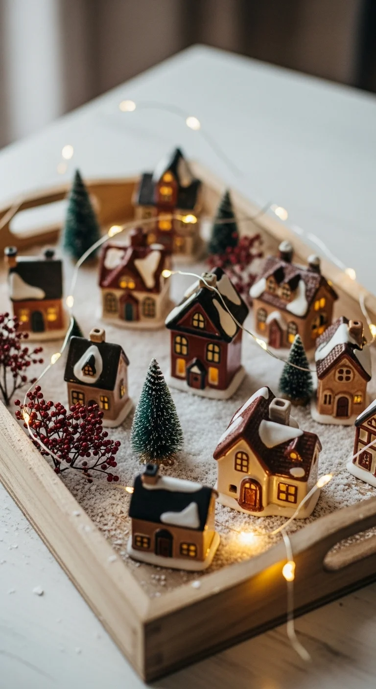 Create a mini winter village inside your tray. Arrange small ceramic houses, tiny bottle-brush trees, and faux snow. Wrap fairy lights around the setup for sparkle. You can find mini houses at dollar stores or thrift shops. It’s a charming display that feels magical day and night.
