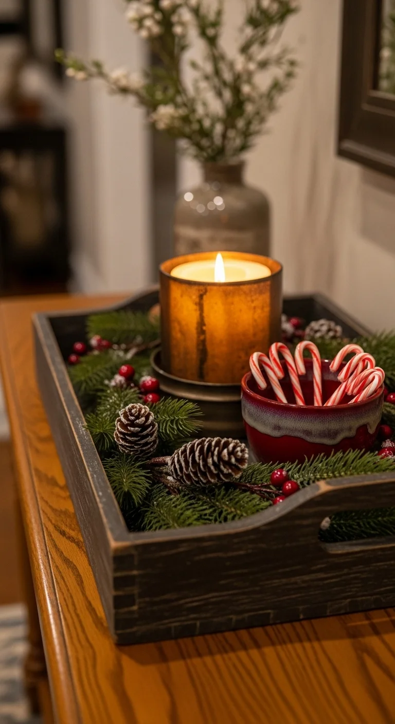 Go for a rustic farmhouse vibe with a simple wooden tray. Add mason jars filled with greenery, pinecones, and small candles. Drape a plaid napkin inside for texture and warmth. A small “Merry Christmas” sign or buffalo check ribbon ties the look together. For an easy DIY, paint an old serving tray white and distress the edges with sandpaper for that farmhouse charm.