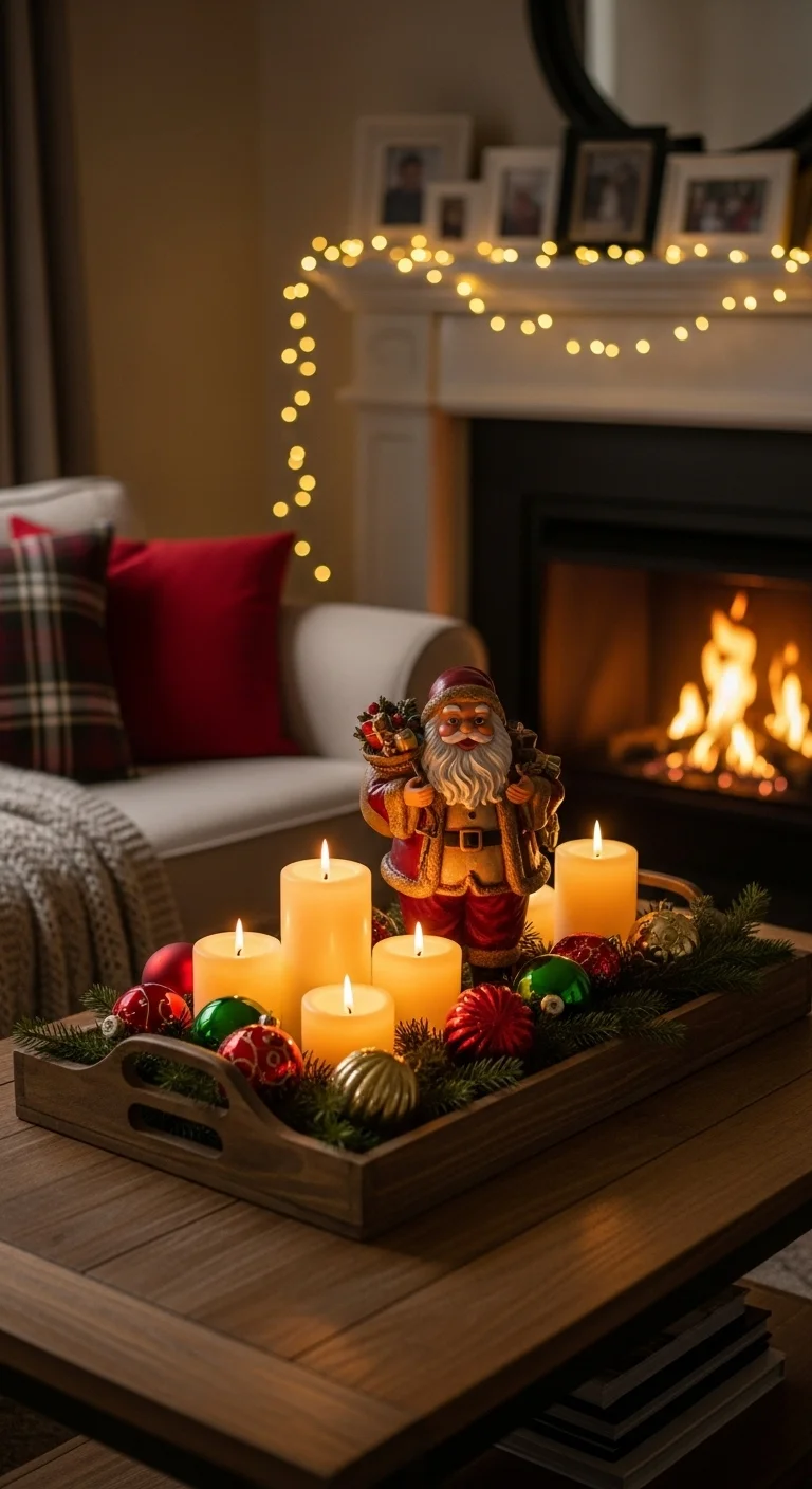 Turn your coffee table into a festive feature. Use a large tray to hold candles, ornaments, and pinecones. Layer textures with a cozy throw or greenery underneath. Stick to a color palette—red and gold for classic, or silver and white for modern. It’s easy to move when guests arrive.