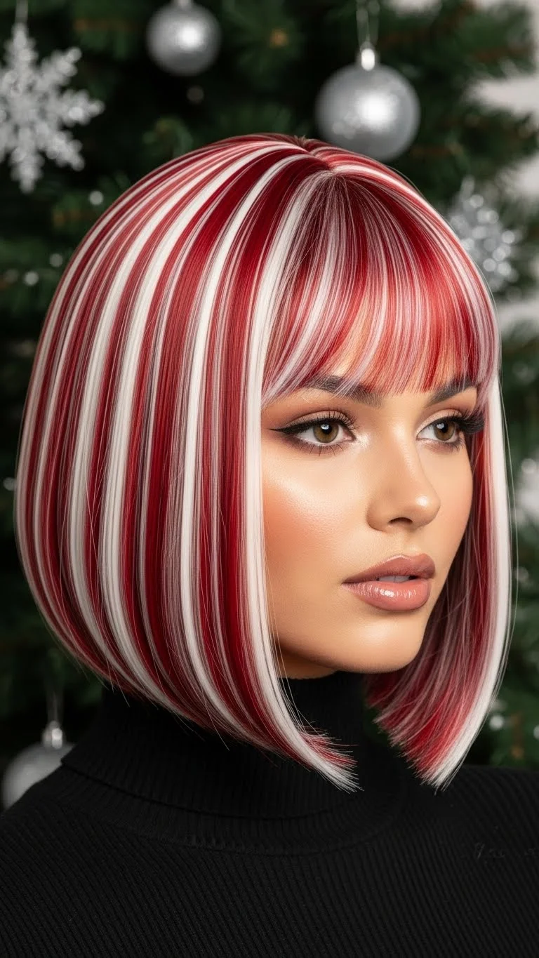 This look is a holiday staple. It uses alternating red and white tracks to mimic a candy cane. You don’t have to buy a custom piece. You can buy a cheap white bob wig and add red clip-in extensions. Alternatively, use temporary hair chalk on a synthetic white wig. It is a budget-friendly way to get the look for one night. Keep the edges sharp for a polished feel. This style works great with a simple red dress. It makes a bold statement without needing many accessories.