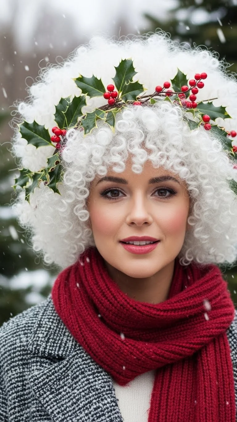 A white afro wig looks like a giant snowball. It is a bold and beautiful choice. Add some artificial holly clips throughout the curls for a pop of color. The red and green against the white looks striking. You can use hair pick to fluff the wig for maximum volume. This is a great choice for those who love big hair. It is comfortable and makes a huge impact. You can find these wigs at most costume shops.
