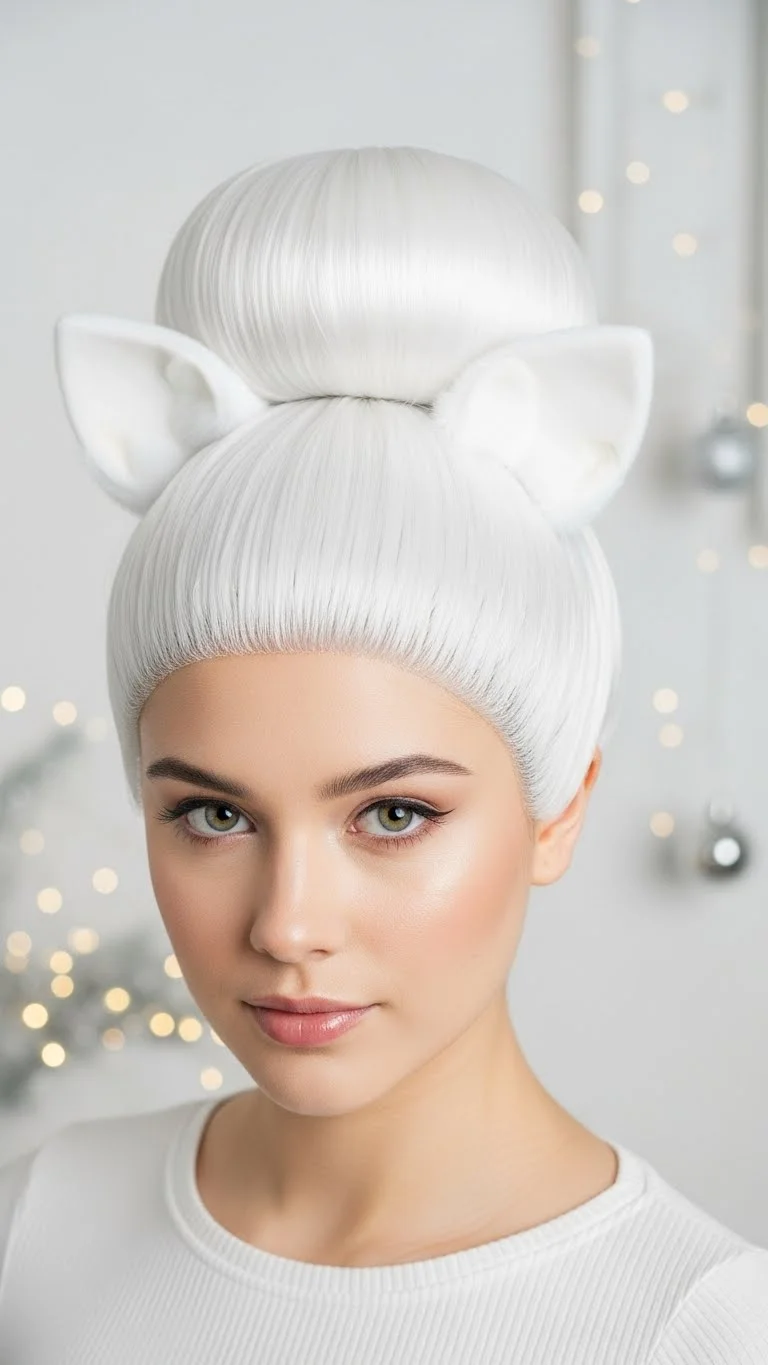 This is a “cosplay-lite” holiday look. Use a stark white wig and pull it into a large bun. Attach fuzzy white ears to the sides. It is a cute way to represent winter animals. You can add a small blue ribbon for a touch of color. This is very popular for family gatherings with kids. It is a simple, clean look that stays in place all day. Use a strong-hold hairspray to keep the bun smooth.