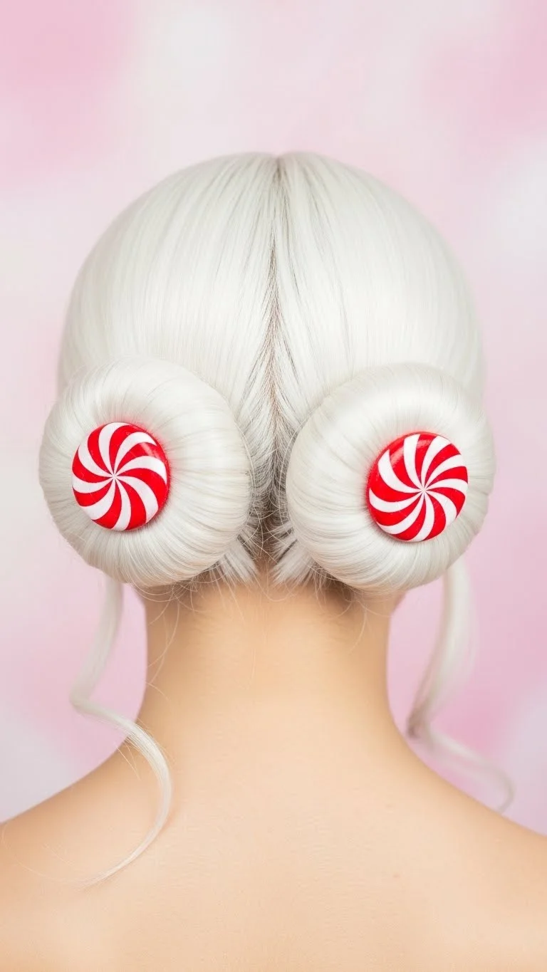 Low buns are easy and comfortable. Use a white wig and create two buns at the base of your neck. Use red hair spray to paint a spiral on each bun. This makes them look like peppermint candies. It is a clever use of color and shape. You can also wrap the buns in red cellophane for a “wrapped candy” look. This is a very creative DIY project. It works best on wigs with medium density.