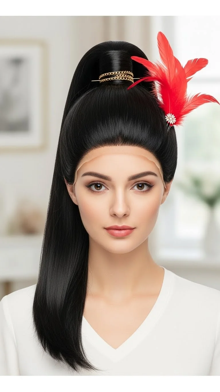 This style is inspired by the Nutcracker. Use a sleek black wig with a very straight ponytail. Add gold chain details or a small red feather plume. This gives a military-inspired festive vibe. It is very structured and sharp. It is a great choice if you prefer a more “costume” feel. You can find gold chains at craft stores and loop them through hair ties. It looks very regal and unique.