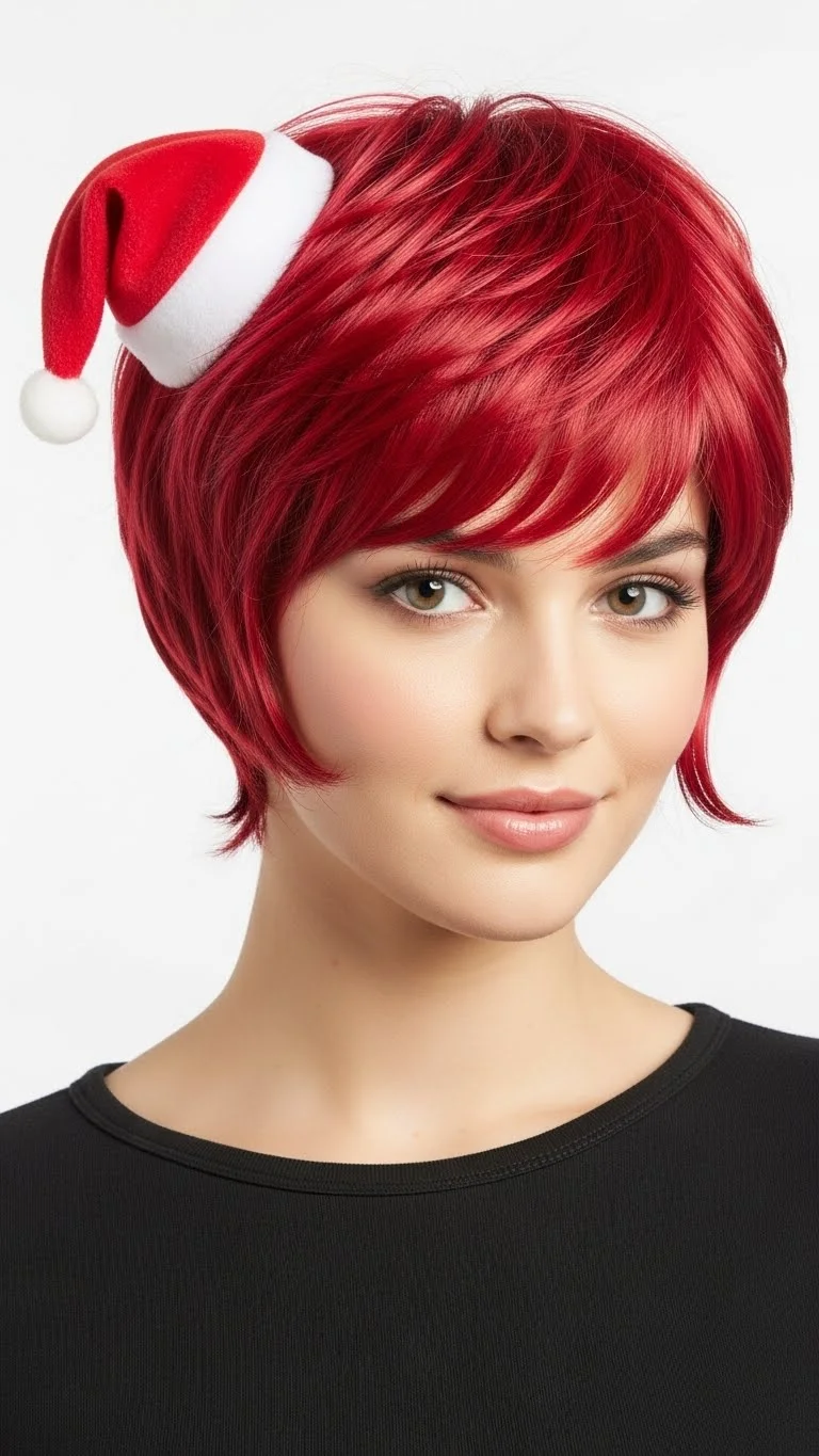 A pixie wig is easy to manage and very comfortable. Choose a bright “Santa Red” shade. To make it festive, use a miniature Santa hat clip. You can find these in the doll section or holiday aisle of most stores. The short hair makes the accessory the star of the show. It is a low-maintenance option for a long day of hosting. You don’t have to worry about tangles. Just shake the wig out and put it on.