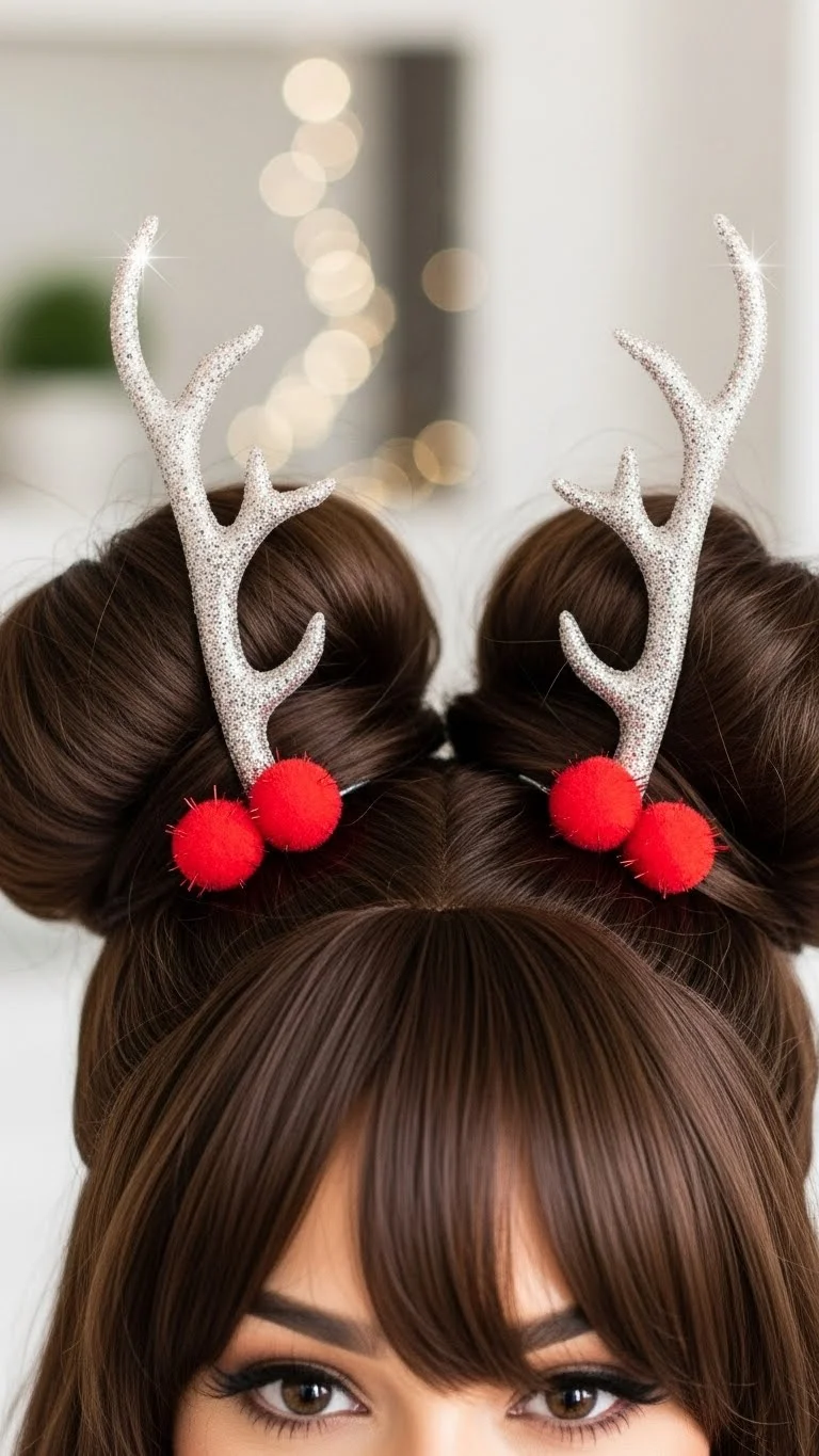 Space buns are trendy and fun. Style a brown wig into two high buns on top of your head. Insert small antler headbands or clips into the buns. Add a red pom-pom to the center of your forehead or just keep it on the buns. This is a favorite for “Ugly Sweater” parties. You can make the antlers out of brown pipe cleaners. It is a very cheap DIY fix. The height of the buns makes this style look very intentional.