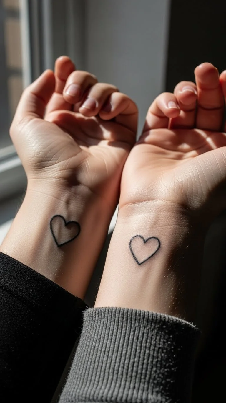 Matching heart outlines stay popular for a reason. They are clean, small, and easy to place almost anywhere. Many couples choose the wrist, ankle, or behind the arm. The outline style keeps the cost low and the healing simple. You can draw the heart yourself and take it to a local artist. This adds a personal touch without extra expense. Thin line work also ages better than heavy shading. If you want a slight twist, one heart can be filled while the other stays open. This shows balance without words. Stick to black ink to keep it timeless. Red ink may fade faster on some skin types. These tattoos fit well with daily life and work settings. They can be hidden when needed. For couples who want something sweet and calm, this design feels natural. It says love without trying too hard.