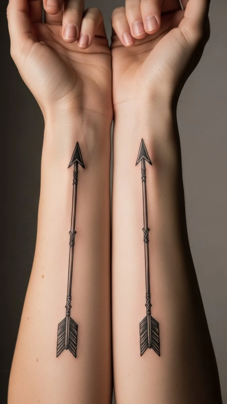 Arrow tattoos show direction and unity. Matching arrows can point toward each other or the same way. Simple lines keep the price low. Avoid feathers or heavy detail. Wrist or ankle placement works well. You can sketch the arrow at home to save time. Black ink keeps the shape clear. This design fits couples who move forward together. It feels calm and strong. The arrow shape holds meaning without extra work.