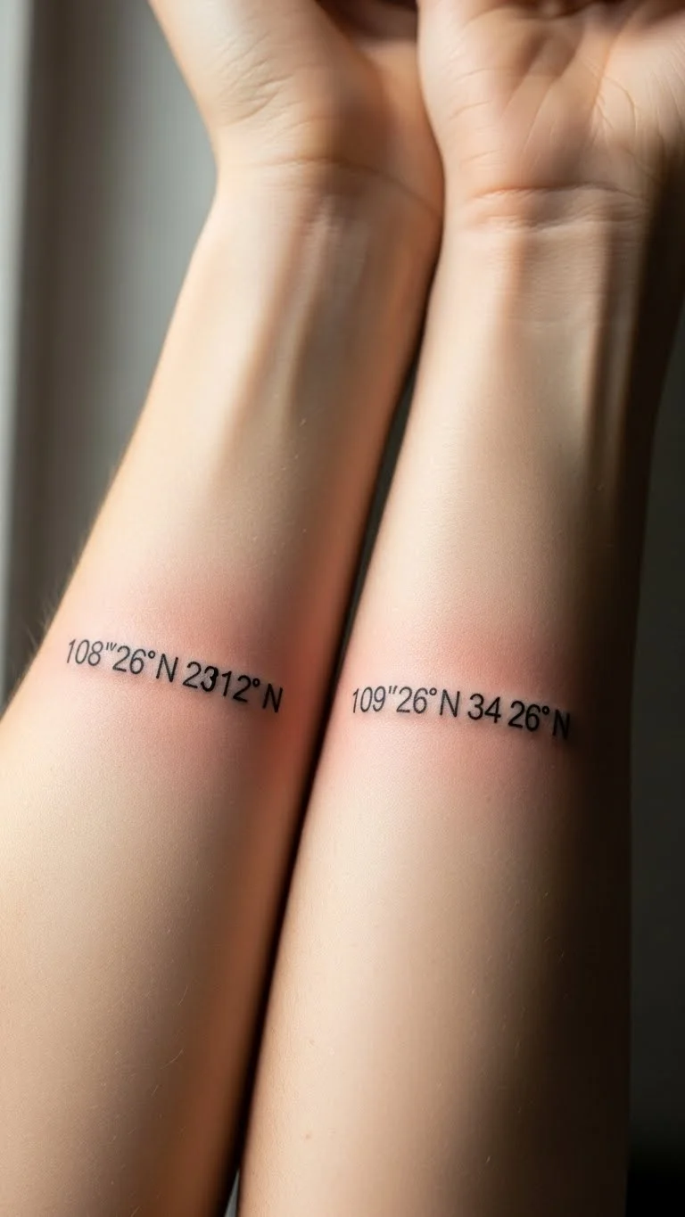 Coordinate tattoos mark a shared place. This could be where you met or shared a key moment. The numbers keep the design simple. This helps control cost. Choose a clean font that stays readable. Inner arm placement works well. Many shops already have number fonts ready. This saves design fees. Black ink keeps the numbers clear. This idea suits couples who value shared memories. The meaning stays private and strong.