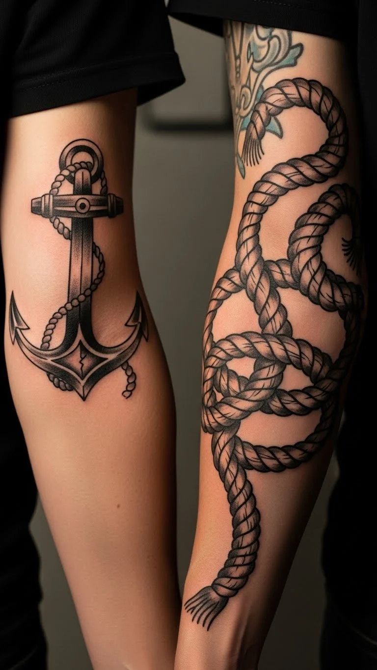 Anchor and rope tattoos show support and trust. The anchor stands for stability, while the rope shows connection. Keep both designs simple. Avoid shading to reduce time. Wrist or calf placement works well. You can match the line style for balance. Black ink works best. This idea fits couples who value support. Each tattoo stands alone but feels linked.