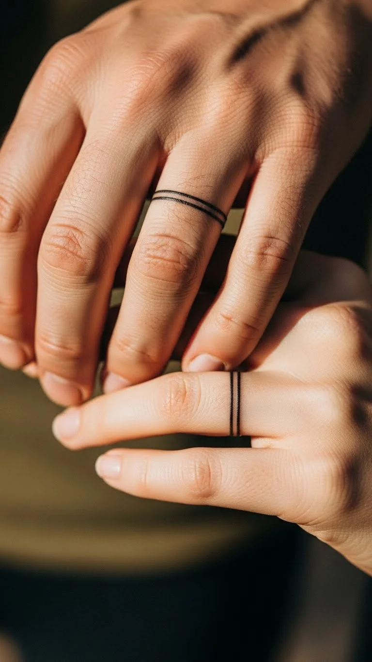 Finger band outline tattoos feel intimate and low-key. They work well for couples who skip traditional rings. A thin line around the finger keeps the design subtle. This tattoo costs less due to its size and speed. Healing time is short with proper care. Many couples choose black ink for clarity. DIY tip: mark the finger lightly with a pen at home. Decide the exact placement together. That saves time at the studio. Some choose a tiny gap in the line for comfort. Others keep it fully closed. Both feel personal. This idea fits daily life without drawing attention. It also stays meaningful without words or symbols.
