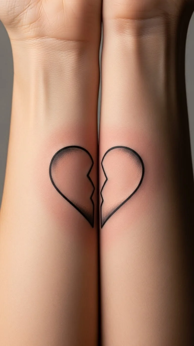 Half heart tattoos show unity through simplicity. Each partner carries one side. When arms meet, the shape completes. Straight edges keep cost low. Placement on forearms or ribs works well. DIY tip: draw a full heart together. Cut it down the middle. Each partner keeps one side. This adds meaning without extra expense. Thin lines heal faster and stay clear. This design feels playful yet serious. It suits couples who enjoy shared gestures. The heart only feels whole when you stand together.