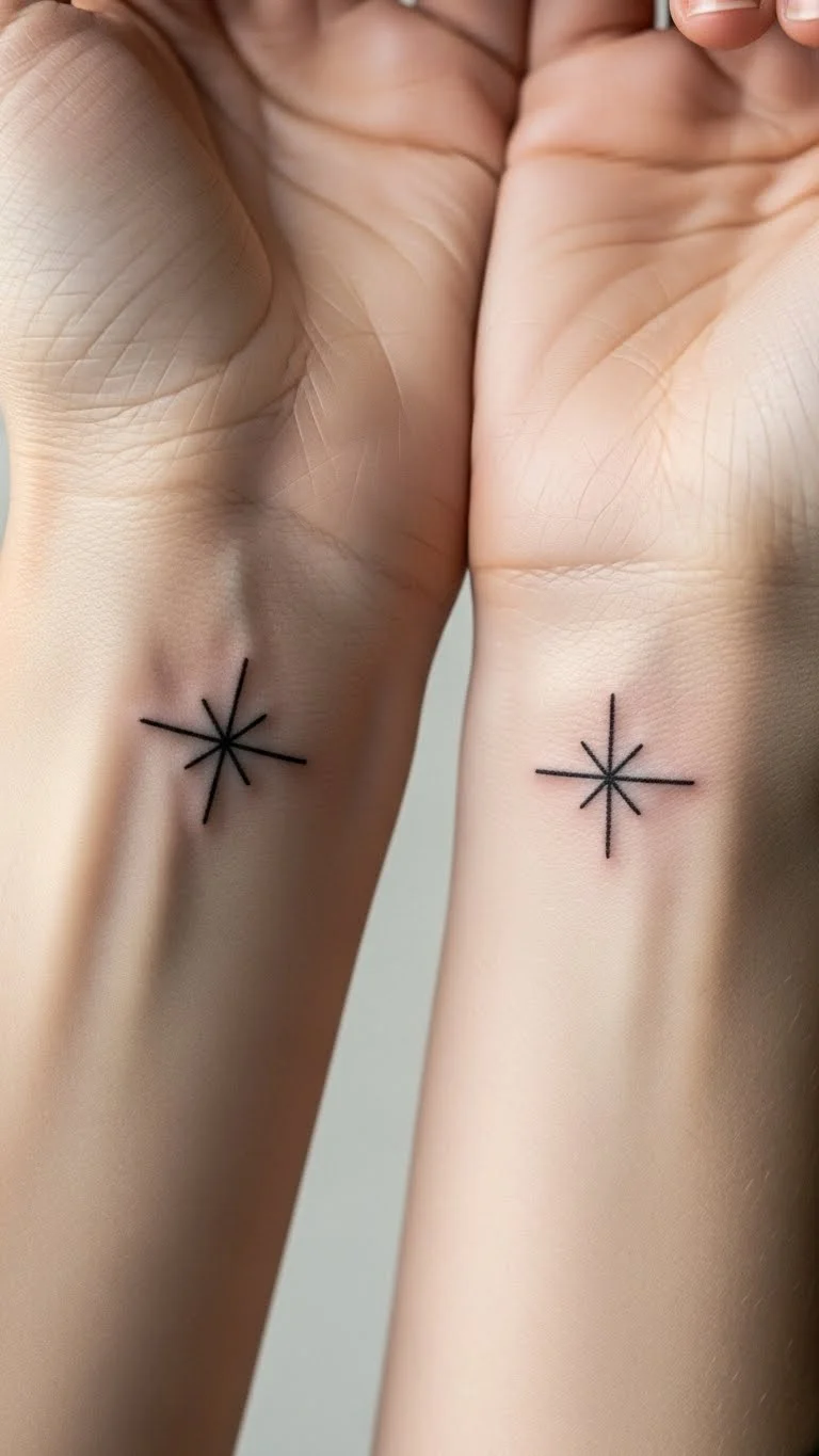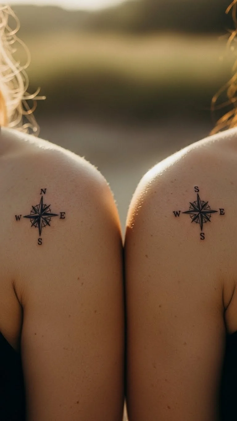 Compass point tattoos show guidance and trust. One partner may choose north, the other south. Keep the design minimal with simple arrows or letters removed. Lines stay clean and budget-friendly. Shoulders or upper arms work well. DIY tip: sketch basic compass arrows at home. Choose the cleanest version. This saves design time. This tattoo suits couples who value direction and support. It also leaves room for future symbols if desired.