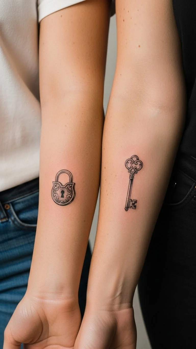 A lock and key tattoo shows trust and closeness. One partner carries the lock, while the other holds the key. The design works well in a small size, which helps keep the price low. Simple line art looks clean and clear even after years. You can place these on wrists, fingers, or near the collarbone. Many couples sketch the lock and key at home to save design fees. Keep the shapes simple to avoid long sessions. Black ink works best for sharp edges. If you want detail, add a tiny heart shape inside the lock. Avoid heavy shading to reduce healing time. This idea suits couples who like balance and meaning. It feels personal without being loud. The design stays clear even when seen alone. That makes it practical for daily wear.