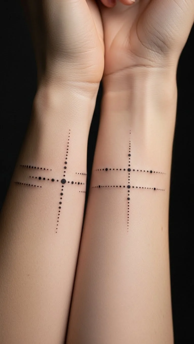 Cross line tattoos stay abstract and personal. Two simple lines crossing feel balanced. Keep the size small for comfort and cost. Wrists or ankles suit this style. DIY idea: decide the angle together. Slight differences add character. This design avoids heavy meaning yet still feels shared. It ages well due to clean lines. This tattoo fits couples who prefer quiet symbols. It also pairs well with other tattoos later.