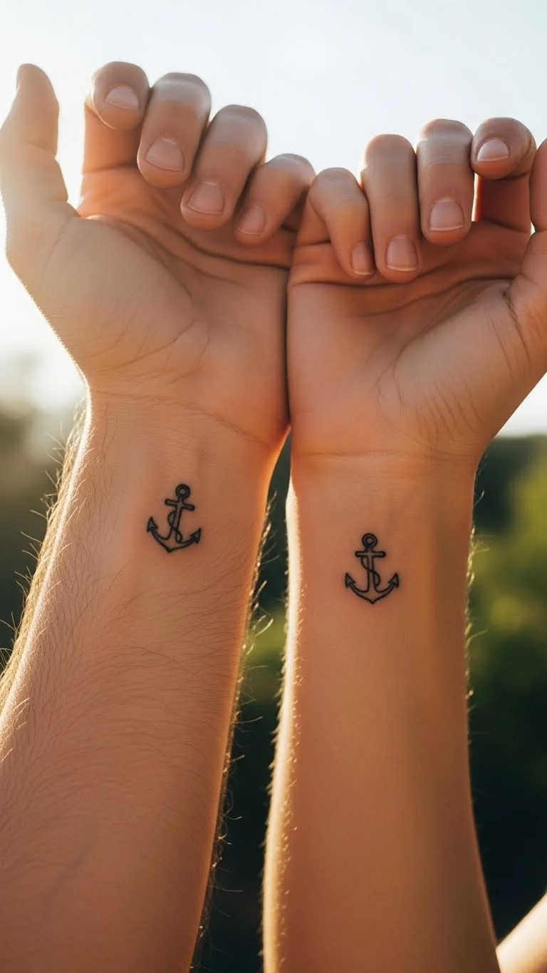 Anchor tattoos show stability and trust. Keep the anchor minimal without shading. Thin outlines reduce cost and pain. Wrists or ankles suit this idea. DIY tip: choose a basic anchor icon. Remove extra curves. This speeds up the session. Some couples choose different anchor sizes. That keeps balance without copying. This design feels steady and calm. It fits couples who value grounding and support.