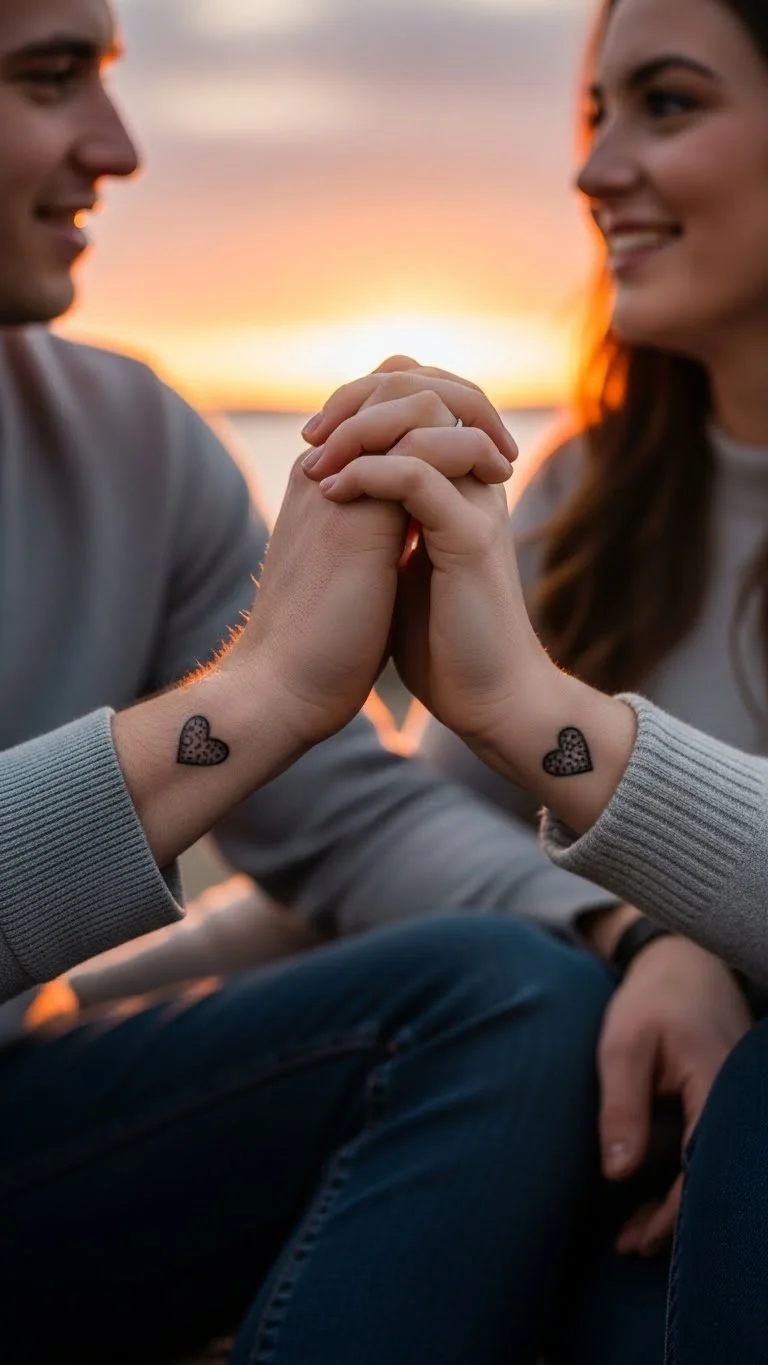 Tiny love symbols work well for couples on a budget. These can be small hearts, arrows, or dots. The smaller the tattoo, the faster the session. This lowers the cost. Finger or wrist placement keeps it visible but subtle. Avoid complex shapes at this size. Simple icons age better. Black ink works best for tiny designs. Healing is quick and easy. These tattoos fit couples who want something light and fun. They feel playful without being loud. Even a small symbol can hold deep meaning when shared.
