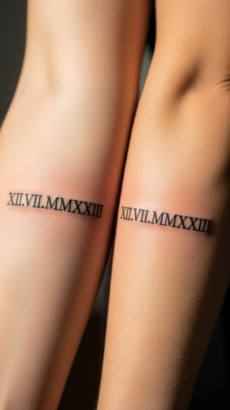 Roman numeral dates carry strong emotion in a quiet way. Couples often choose the day they met or married. The numerals add a classic feel without extra design work. This keeps costs down and sessions short. Inner arms, ribs, or shoulders work well for placement. The font choice matters more than size here. Pick a clean font that stays readable over time. Avoid thin lines that may fade quickly. Many tattoo shops already have Roman numeral templates, which saves money. You can also bring a printed version from home. This design feels personal but private. Only those close to you may know the meaning. It works well for couples who prefer subtle ink. The date becomes a shared reminder without drawing attention.