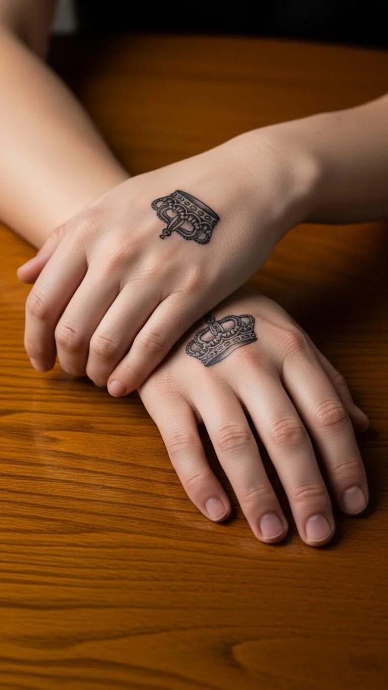 Small crown tattoos show respect and partnership. One crown can be slightly taller, or both can match exactly. Keeping the design minimal helps with cost and healing. Line-based crowns work best for small sizes. You can place them on fingers, wrists, or behind the ear. Some couples choose initials under the crown, but this adds time and cost. A crown alone still sends a clear message. Black ink keeps it sharp. Avoid fine dots that may blur over time. This idea fits couples who see each other as equals. It feels strong but simple. The crowns stand alone well, even when you are apart. That makes the design practical and meaningful.
