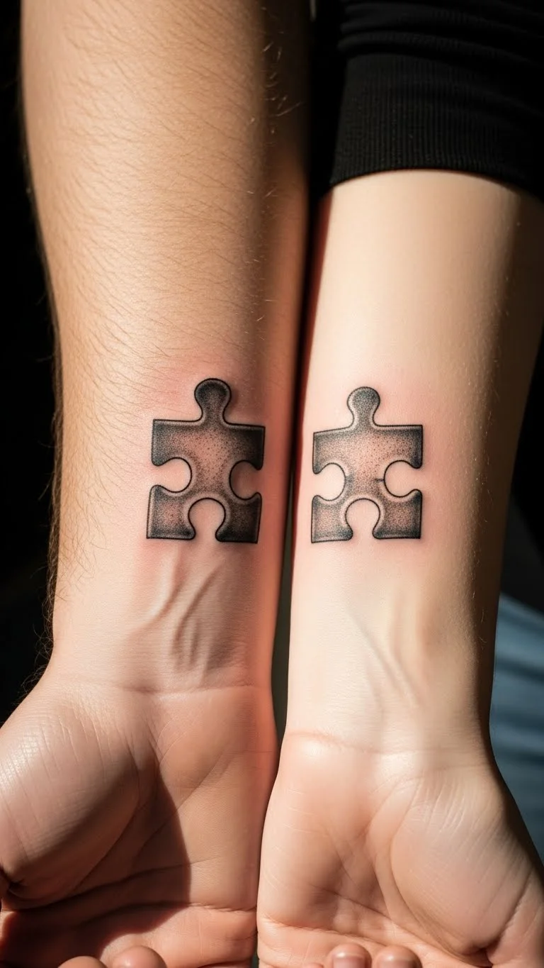 Puzzle piece tattoos show how two people fit together. Each partner carries one piece. When placed side by side, the shape completes. The design works best with clean edges and simple lines. This keeps sessions short and affordable. Avoid too much detail inside the piece. Empty space ages better. Many couples choose the forearm or calf for easy alignment. You can draw the puzzle shape yourself to save money. Ask the artist to keep both pieces the same size. This helps with balance. Black or dark gray ink works well. This idea suits couples who value teamwork. It shows connection without words. The meaning stays clear even after many years.