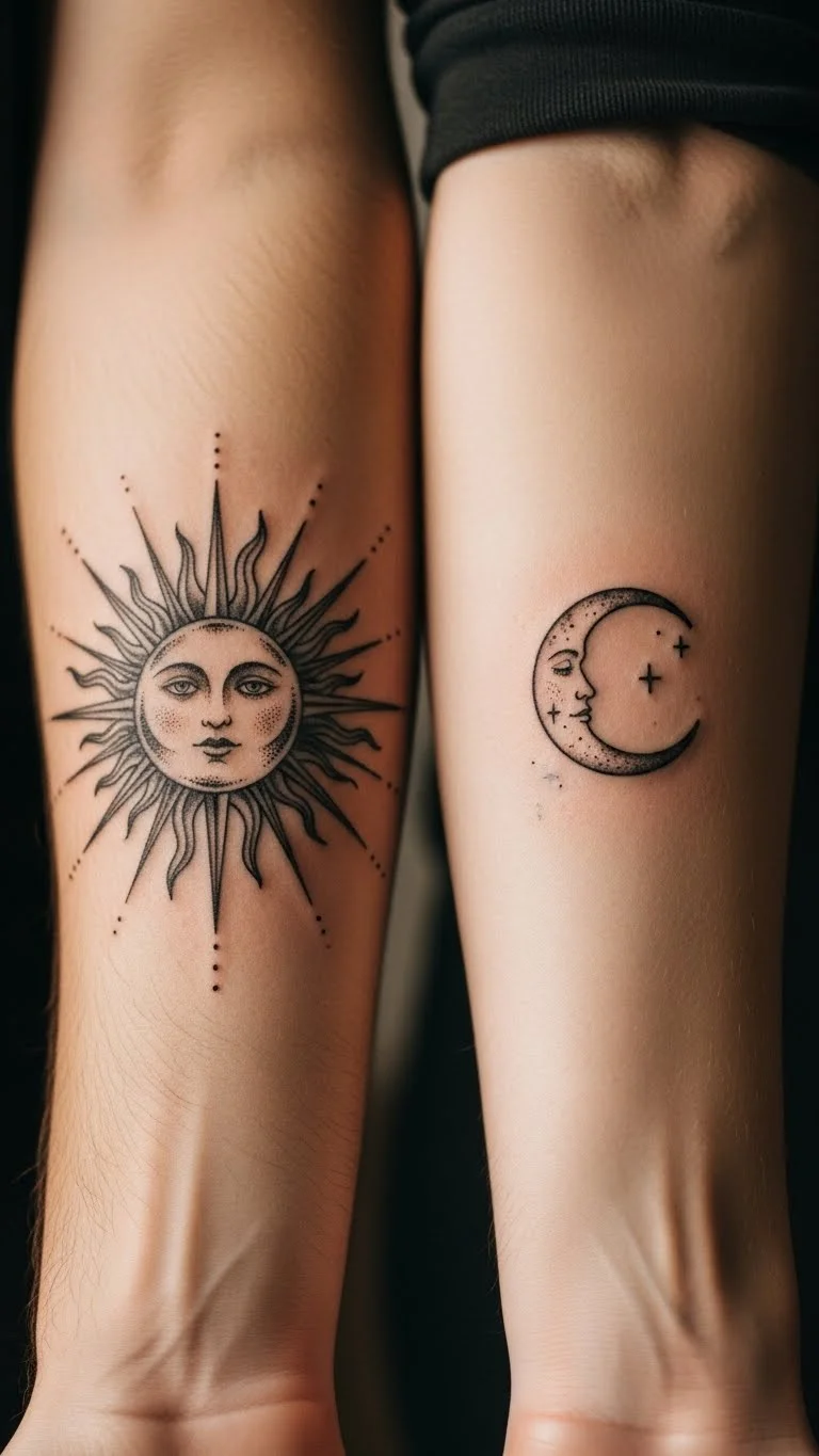 Sun and moon tattoos show balance and contrast. One partner carries the sun, the other the moon. The designs work well in small sizes. Simple line art keeps the cost low. Avoid heavy shading for faster healing. You can place these on shoulders, wrists, or calves. Many artists already have sun and moon samples, which saves design time. Choose a style that matches both tattoos. This keeps them connected. Black ink works well for both symbols. This idea suits couples who balance each other. It feels calm and thoughtful. Each tattoo stands alone but feels complete together.