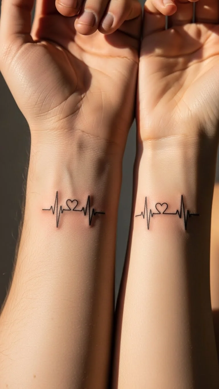 Heartbeat line tattoos feel personal and modern. The design is simple and quick. This helps keep the price low. Many couples choose the same line pattern. Others adjust the length slightly. Both options work well. Place them on the wrist, arm, or chest area. Thin lines look clean but should not be too light. Ask for steady line weight to avoid fading. You can base the line on a real heart monitor image. Print it at home to save money. This tattoo fits couples who value shared rhythm. It feels close and honest. The design stays clear without extra detail.