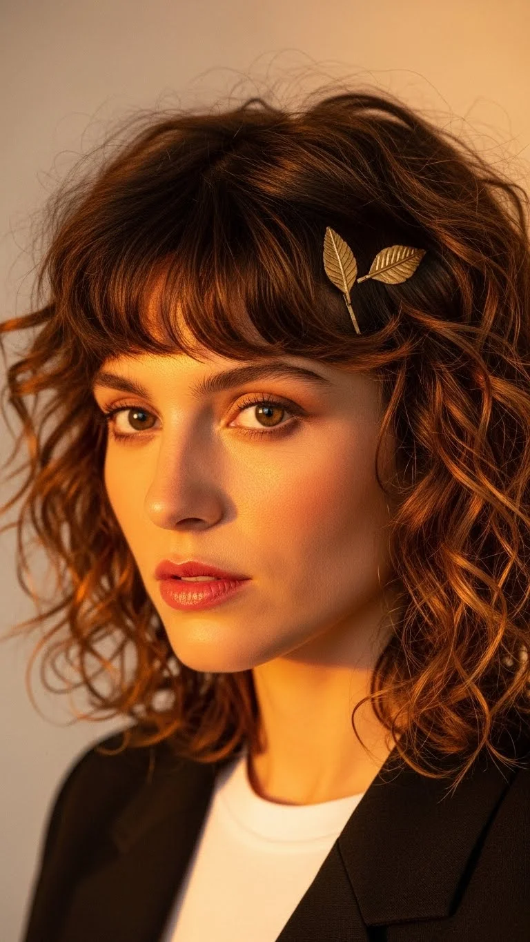 If you have curly bangs that are acting up, just pin them. Take the front section of your hair and twist it slightly. Secure it to the side or straight back with a decorative clip. This opens up your face and lets your eyes shine. It’s a simple change that makes your everyday hair feel special. Use clips with stars, leaves, or snowflakes to stay on theme. This is an excellent solution for the awkward “growing out” phase of bangs. It takes almost no effort but looks very sweet.